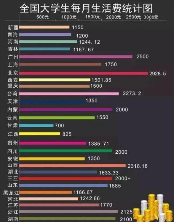 就拿北京和甘肃来举个例子,北京市的学生平均生活费近3000元,而甘肃省的学生平均生活费才700元,两者之间相差了好几千元。