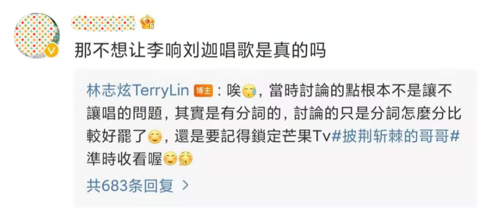 对于此事,林志炫在微博上回复过网友,他说并不是自己不让其他人唱歌,是有分词的,当时只是在讨论分词怎么分。