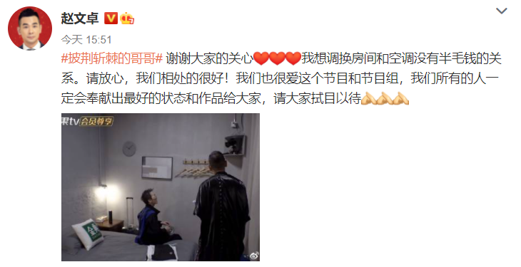 关于这事,林志炫又发微博解释,不是自己不让开空调,是赵文卓要养生先说不开的。