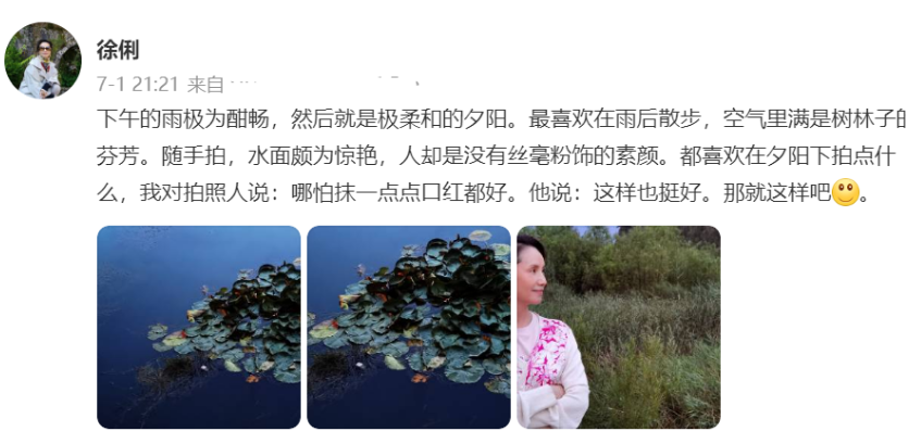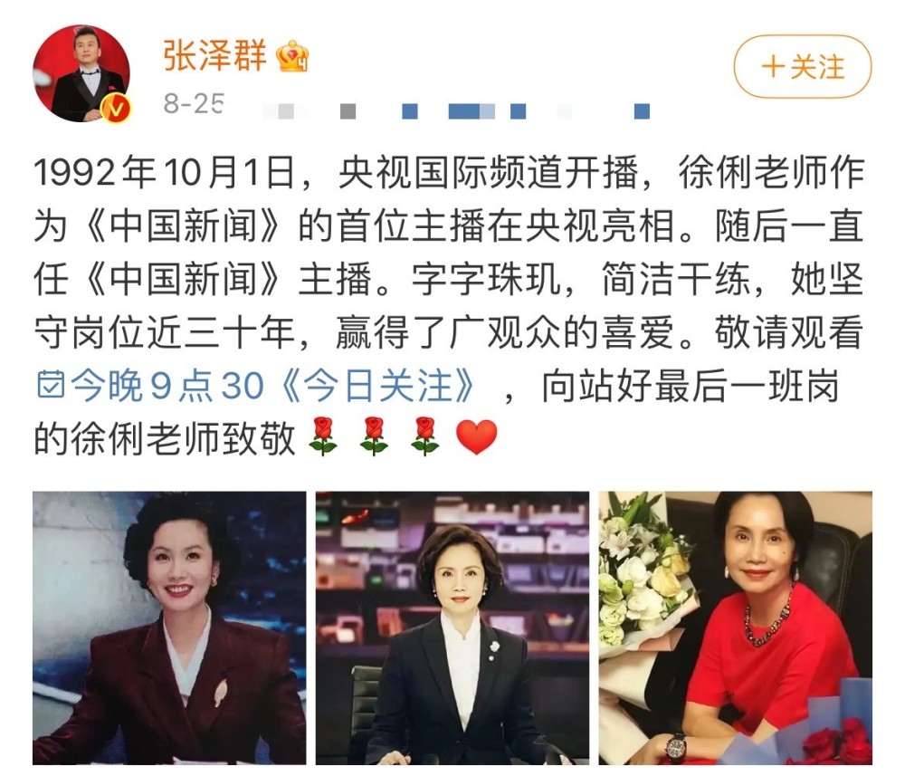 她告别的消息留言区有人祝福她退休快乐,还有网友不认识徐俐的先生便问先生也是主播吗?得到的回复是“青年报的评论员张天蔚”。