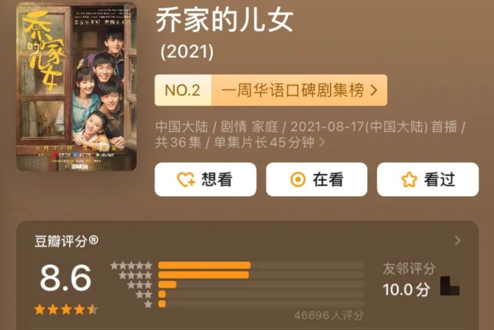 作为暑期档目前豆瓣评分最高的剧,《乔家的儿女》口碑和热度双丰收。