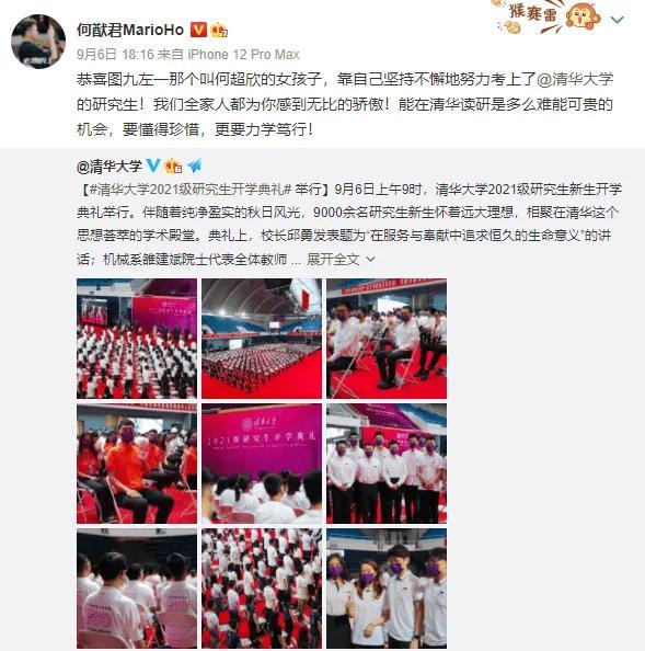 9月6日,何猷君在个人社交账号上转发了清华大学的图文动态,庆祝何超欣妹妹入学。