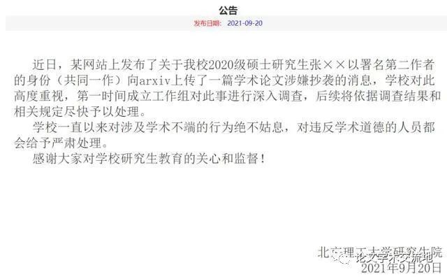 9月20日,北京理工大学研究生院网站发布公告称:近日,某网站上发布了关于我校2020级硕士研究生张××以署名第二作者的身份(共同一作)向arxiv上传了一篇学术论文涉嫌抄袭的消息,学校对此高度重视,第一时间成立工作组对此事进行深入调查,后续将依据调查结果和相关规定尽快予以处理。