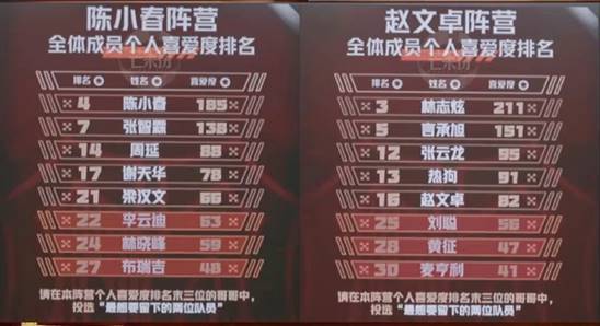 虽然现在仅出了陈小春阵营赵文卓阵营的个人喜爱度排名,不难看出的是,三公排名基本上大换血,陈小春、言承旭掉出前三,现在排第四、第五。