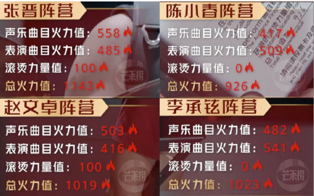 陈小春阵营的声乐曲目《护花使者》仅获得奖417火力值,是四大阵营中声乐曲目火力值最低的。