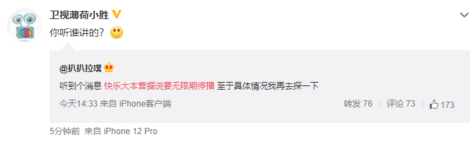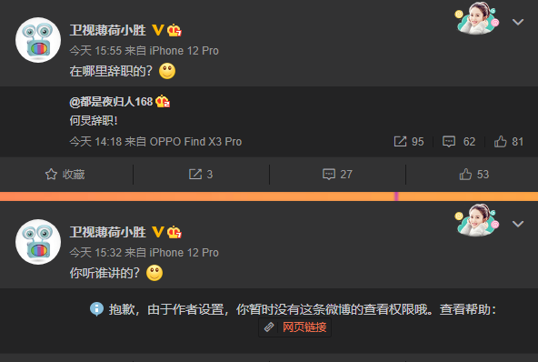 果然不久后,该谣言受到了湖南卫视一名工作人员的注意,这名工作人员的微博账号叫做“卫视薄荷小胜”。