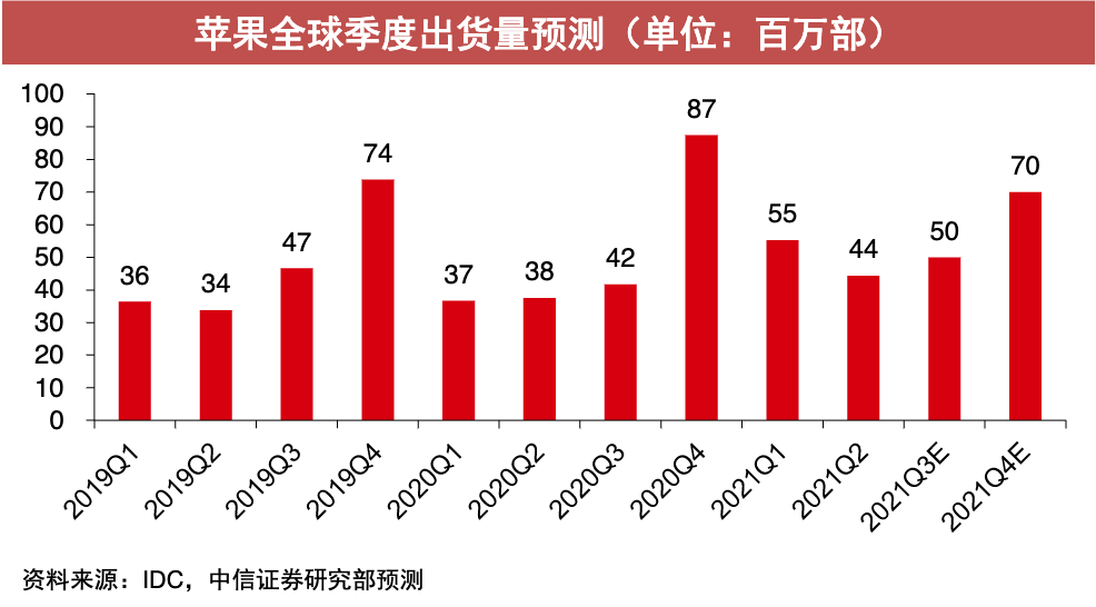 苹果全球季度出货量,图源中信证券报告