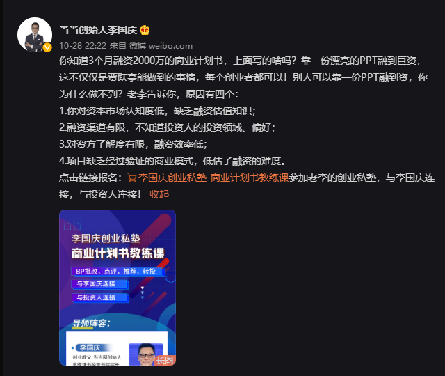 日前,李国庆通过微博认证账号多次发布卖课消息,根据其发布的商业计划书教练课,每个创业者都可以靠PPT融资。课程9990元一人,限50人;导师晚宴限20人,费用另计。课程包含商业计划书书面修改意见、融资策略指导、连接创业教父李国庆等。