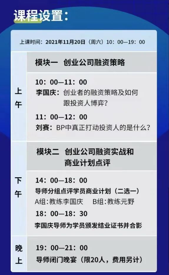 宣传海报显示,该课程称为“李国庆创业私塾商业计划书教练课”,以“李国庆”为卖点,并承诺BP(商业计划书)书面修改意见、融资策略指导、连接创业教父李国庆等。李国庆还在宣传中指出,其将为学员颁发结业证书并合影,晚上还有导师闭门晚宴,限20人,费用另计。
