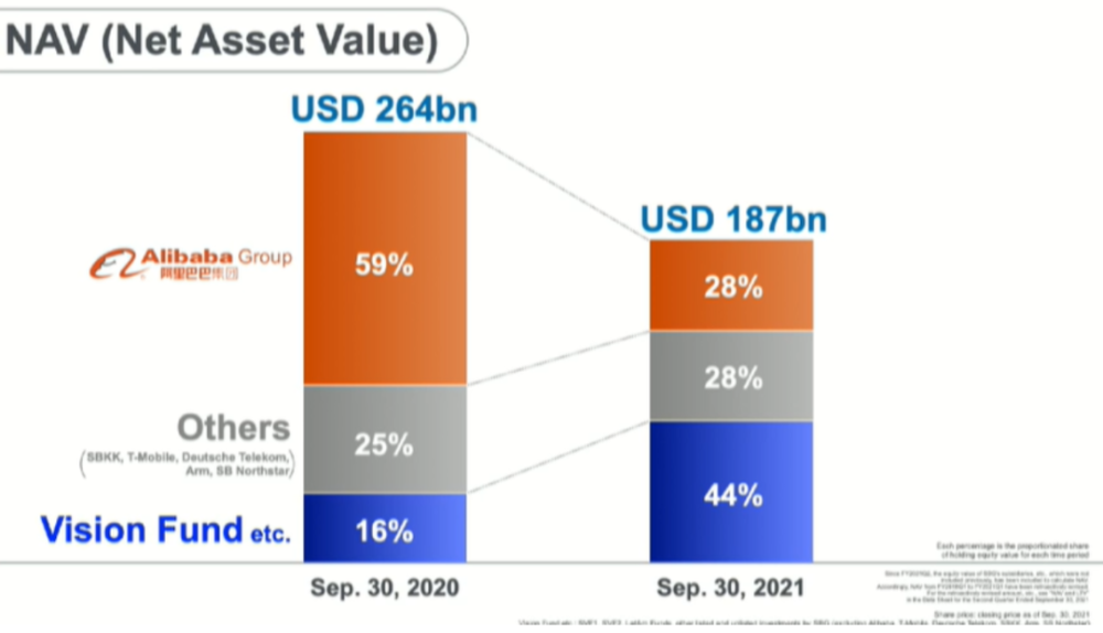 面对这份财报,软银CEO孙正义在财报发布会上表示,目前,公司正处于“暴风雪”中,净利润遭遇大幅下降,更重要的指标是,公司的净资产价值在一年内下降超过770亿美元,其中愿景基金第一大重仓股阿里巴巴的仓位占比已经下降至不足30%。