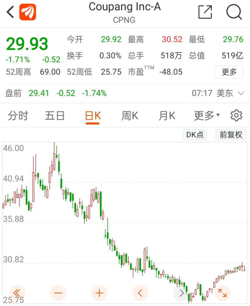 首先是,韩国最大的电商企业Coupang,今年7月以来,其股价连续遭遇大跌,三季度的最大跌幅超44%,总市值蒸发351.54亿美元(约合人民币2249亿元)。