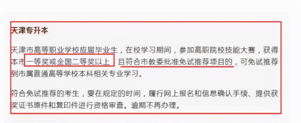 除此之外,在专科院校就读期间表现优异的的天津学子,如果参加过相关领域的职业技能赛事,并获得市级一等奖或者国家二等及以上的荣誉,在满足免试要求项目要求后,就可以申请到本市的相关专业内进行继续深造。