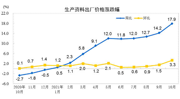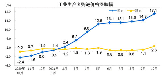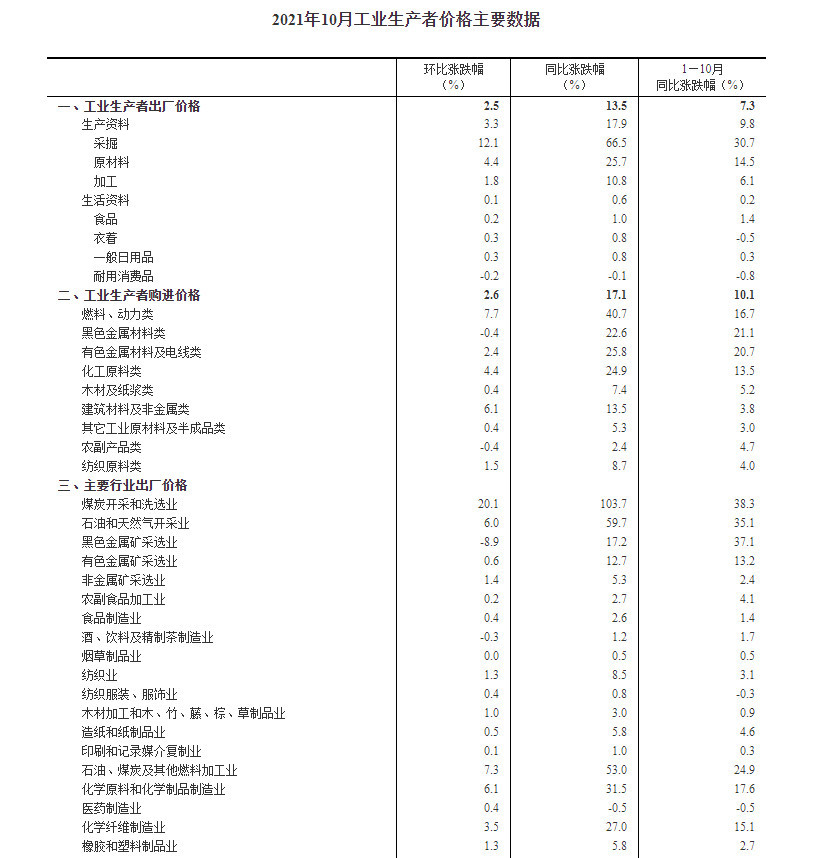 2021年10月份,全国工业生产者出厂价格同比上涨13.5%,环比上涨2.5%;工业生产者购进价格同比上涨17.1%,环比上涨2.6%。1—10月平均,工业生产者出厂价格比上年同期上涨7.3%,工业生产者购进价格上涨10.1%。