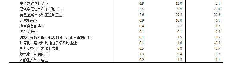 工业生产者购进价格中,燃料动力类价格上涨7.7%,化工原料类价格上涨4.4%,有色金属材料及电线类价格上涨2.4%;黑色金属材料类价格下降0.4%。