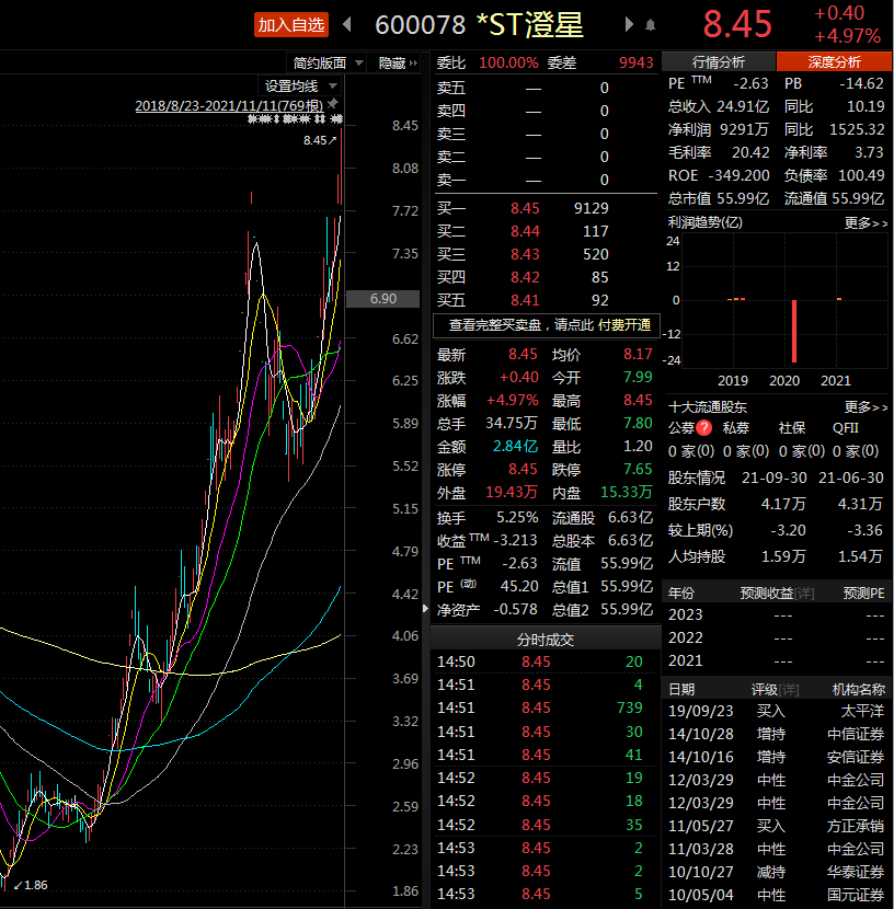 从今年5月21日至今,*ST澄星股价从最低的1.86元涨至8.45元,涨幅高达344.74%。