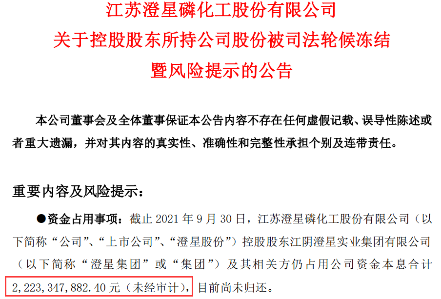 11月10日晚,*ST澄星公告称,目前公司控股股东澄星集团合计持有公司股份占公司总股本的25.78%,这些股份已经被全部冻结;同时,截止2021年9月30日,控股股东澄星集团及其相关方仍占用公司资金本息合计22.23亿元(未经审计),目前尚未归还。