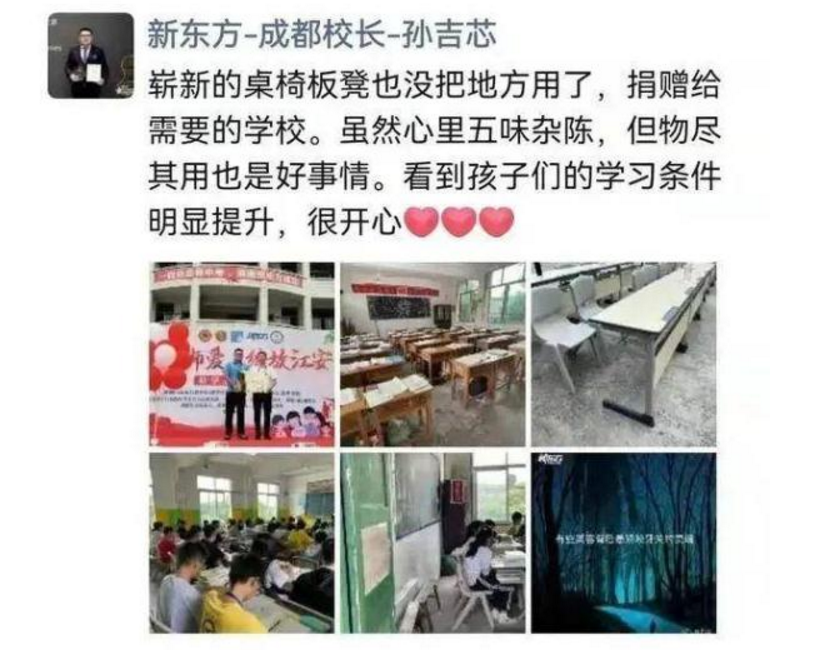 后就有消息称:“新东方已经把部分线下授课点的课桌椅,捐给了贫困山区中小学校。”