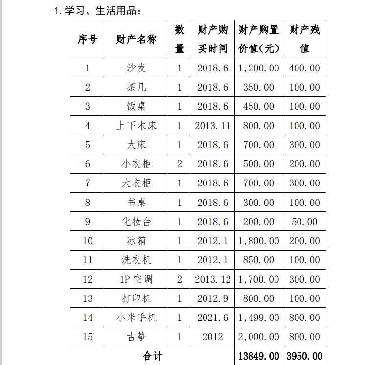 17件学习、生活用品财产,多为床、衣柜、饭桌、书桌等家具,八九年前购买的冰箱、洗衣机、空调、打印机,还有一部今年6月购置的1499元国产手机,是全部家电。上述财产残值总和仅为3950元。