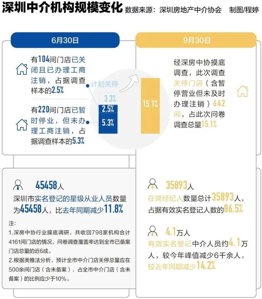 张媛是深圳房地产中介协会(以下简称“深房中协”)秘书长,在她看来,今年深圳对二手房调控的深度和时间长度,有史以来从未有过。深房中协每隔一段时间便会对全市的中介摸底调查,截至9月30日,深圳关停门店642个,占问卷调查总量15.1%,有效实名登记中介人员约4.1万人,较今年峰值减少6000余人,较去年同期减少14.2%。