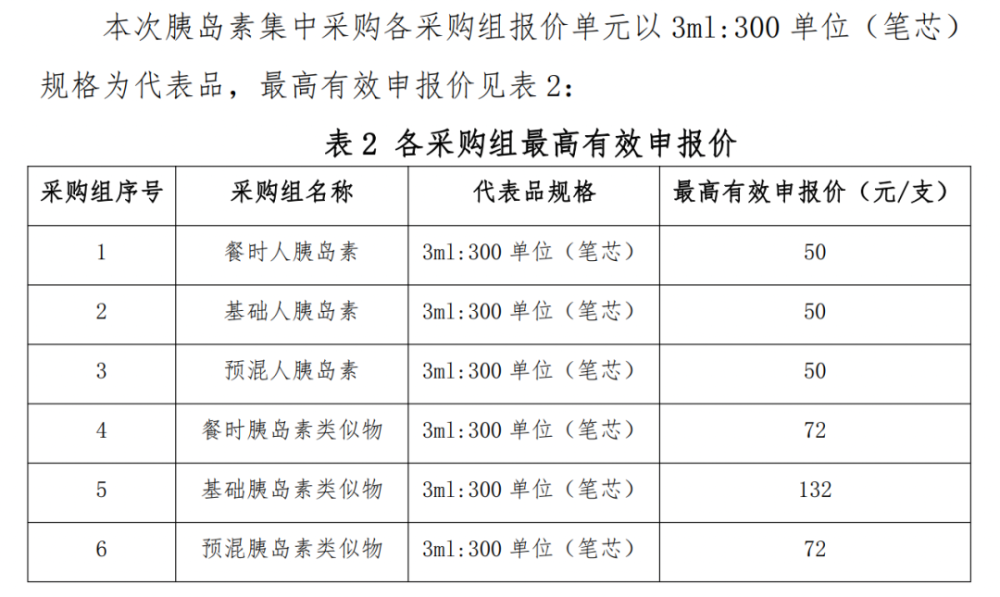 公告显示,本次胰岛素集采各采购组报价单元以3ml:300单位(笔芯)规格为代表品,不同品种给出了最高有效申报价。其中餐时人胰岛素、基础人胰岛素、预混人胰岛素最高有效申报价为50元/支,餐时胰岛素类似物、预混胰岛素类似物为72元/支,基础胰岛素类似物为132元/支。