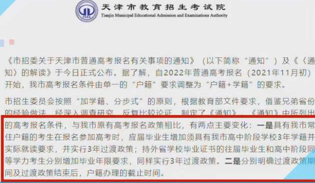 天津市公布《关于普通高考报名有关事项的通知》,明确通知天津市的高考报名条件,从原本的户口要求变成户籍加学籍的要求,计划2022年实施也就是今年。