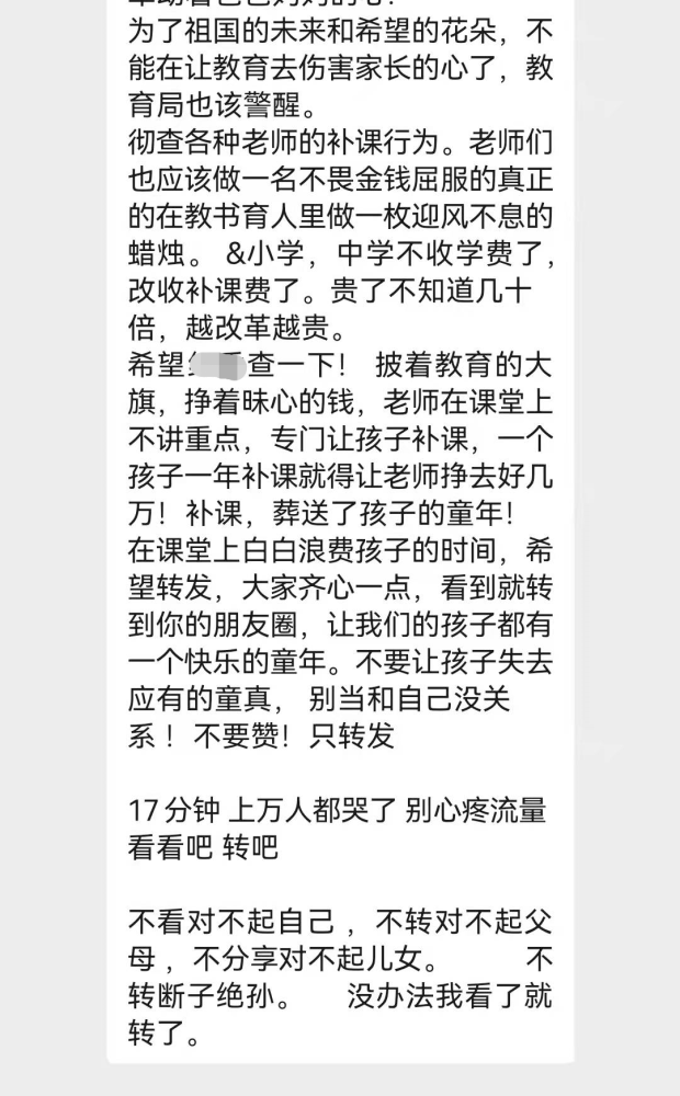 比如有位家长性格略偏激,坚信老师在课堂上没有教授所有知识,所以自家小孩成绩上不去,隔三岔五在家长群里转发一些小作文控诉。