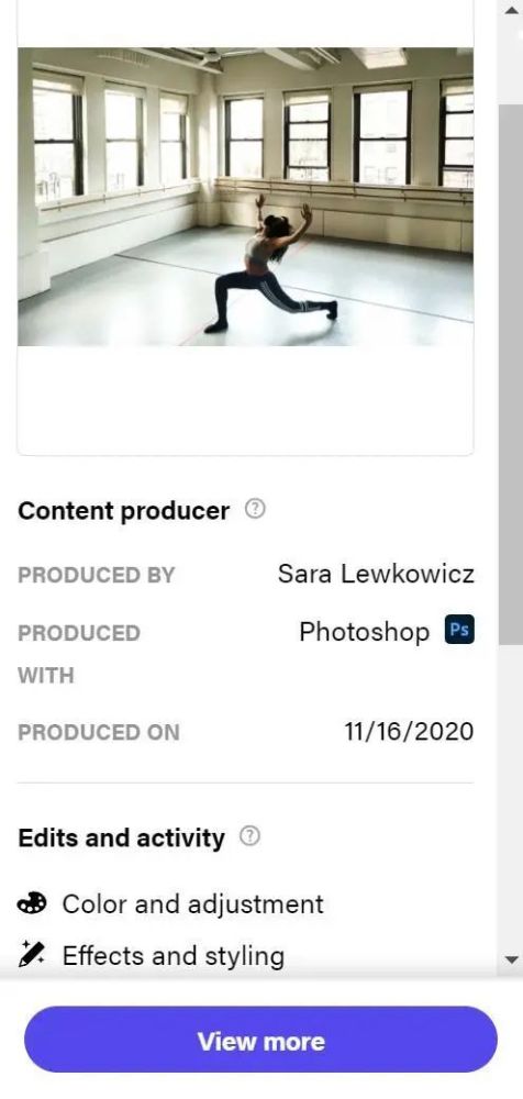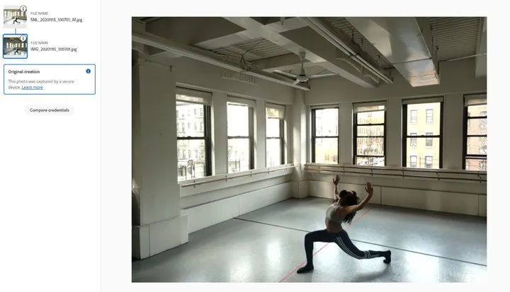 经过认证的真实照片会在右上角多一个「i」的小角标,当你点击它时,你就可以看到由相机生成的拍摄日期、地点、镜头等详细信息,而如果有人用 Photoshop 等软件修改过该照片,你还可以回退到照片的原图,得到完整图像。