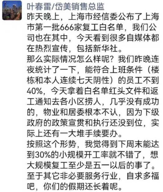 汽车零部件公司上海岱美股份销售总监叶春雷曾表示,“能符合上班条件的员工不到40%,今天拿着白名单红头文件和返工通知去各小区捞人,几乎没有成功的,物业和居委根本不认,因为下级政府的政策宣贯和执行还没到位,实际上还有一大堆手续要办。下周末能达到30%的小规模开工率就不错了,想大规模复工至少是五一以后的事了。”