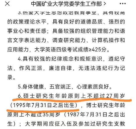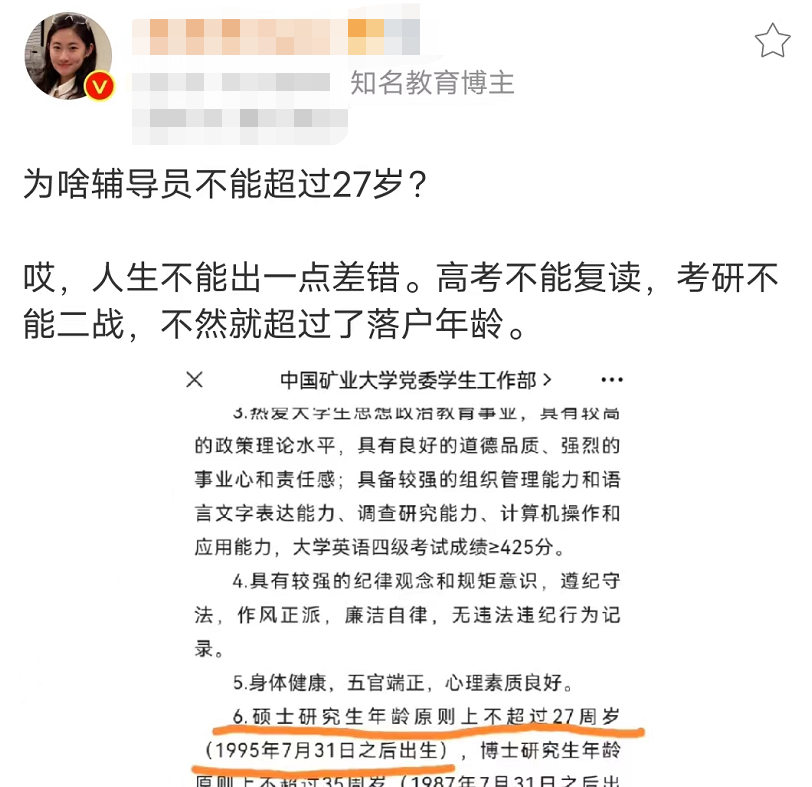 原因就是这所大学对辅导员的年龄要求限制在27岁,只要是27岁以上的学生都算是超龄,一律不会被录用。但是在大家的印象中,27岁还是正当青春的好年龄,难道在这个年龄就已经被嫌弃了吗?
