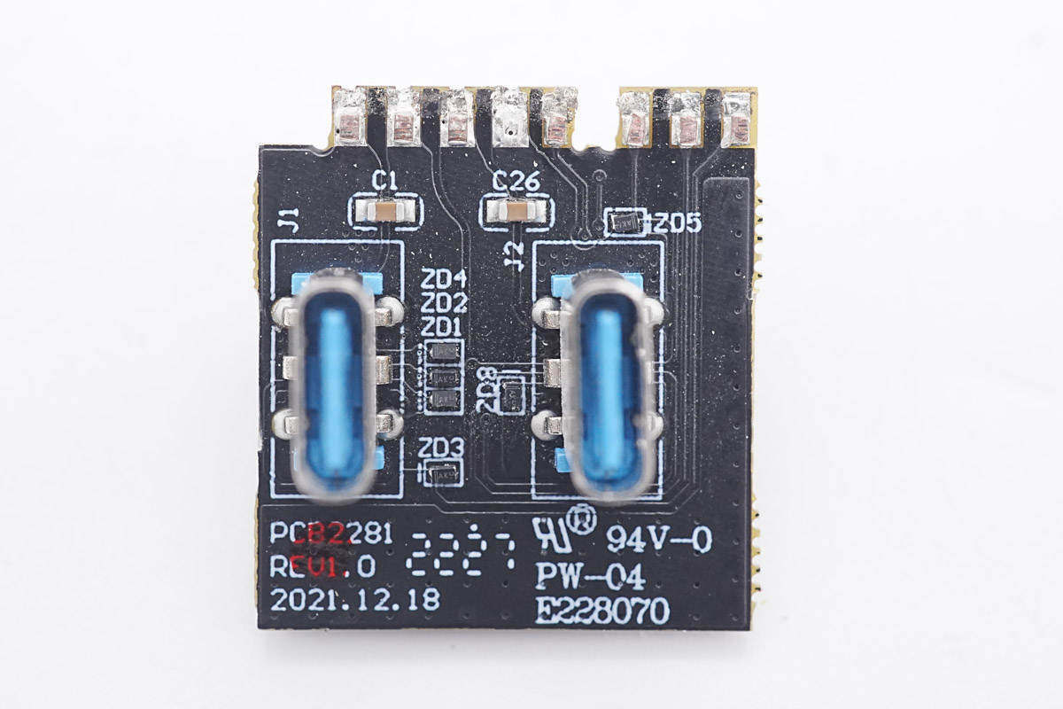 两个USB-C母座焊接在小板上,小板上还焊接用于静电保护的ESD二极管。