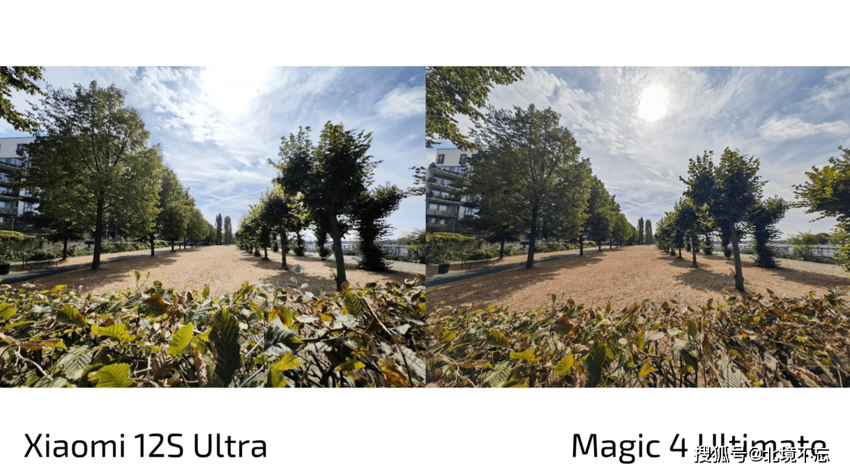 超广角拍照对比,两款手机拍摄的画面效果与主摄大不相同,右边荣耀Magic4至臻版逆光环境下,超广角画面质量更好,天空、树木以及地表细节更丰富。而左边小米12SUItra显然更差些意思。