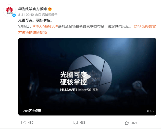 随着华为宣布了Mate 50系列将于9月6日正式发布,近日,在华为 Mate 50系列预热的宣传视频中,也正式宣布Mate 50系列将采用可变光圈镜头,并且搭载自成一派的影像技术,宣称“难以置信,Mate相信”。