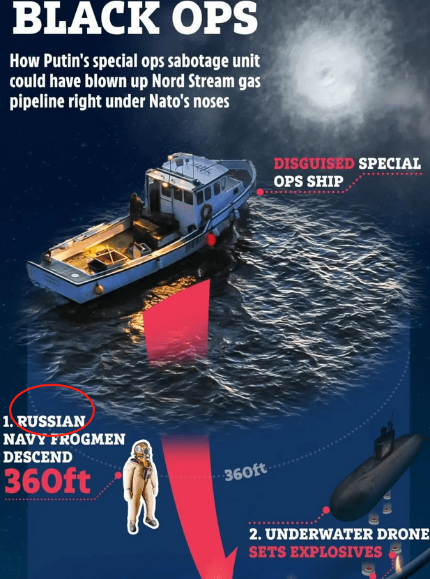 欧美的“阴谋论”媒体和所谓的军事专家的推测,都试图在证明一个论点:俄罗斯对管道进行自我摧毁,目的是为了实现他们不向欧洲供气的目标,给欧盟国家一个教训。他们甚至详细地画出了“北溪管道被破坏流程图”,把里面的潜水蛙人形象标注了“俄罗斯人”。但不同意见者提出异议:俄罗斯如果不想向欧洲供气,他们大可以完全关闭管道即可,为什么要炸毁自己耗资数十亿美元建造的管道?且从“受益方”的角度来考虑,这样做对俄罗斯没有好处。