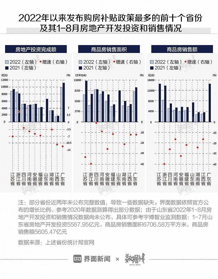 界面数据统计了发布购房补贴政策数量前十的省份,以及各省今年1-8月房地产情况,发现除山东省尚未公布最新数据外,其他省份房地产开发投资与商品房销售面积均不及去年同期数据。其中,江苏省商品房销售面积同比下降33.75%,浙江省则同比下降39.9%,四川省降幅最小,仅下降了1.2%。