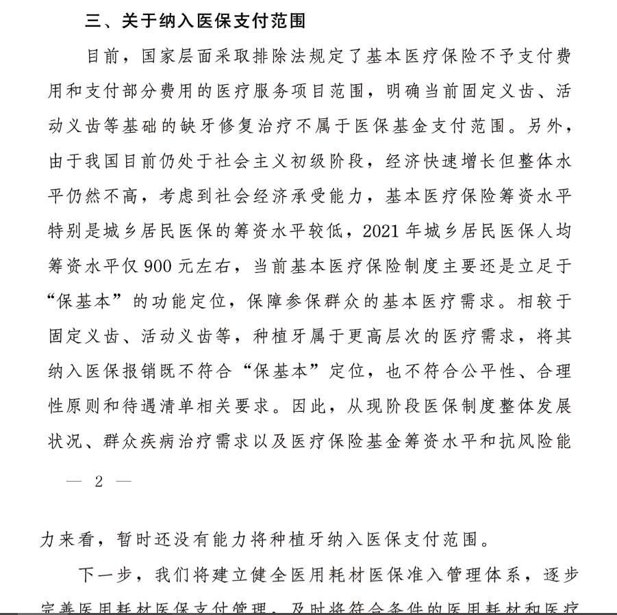 在对仇冰玉代表关于将种植牙纳入医保支付范围建议的回复中,国家医保局明确,相较于固定义齿等,种植牙属于更高层次的医疗需求,从现阶段医保制度整体发展状况、群众疾病治疗需求以及医疗保险基金筹资水平和抗风险能力来看,暂时还没有能将其纳入医保支付范围。