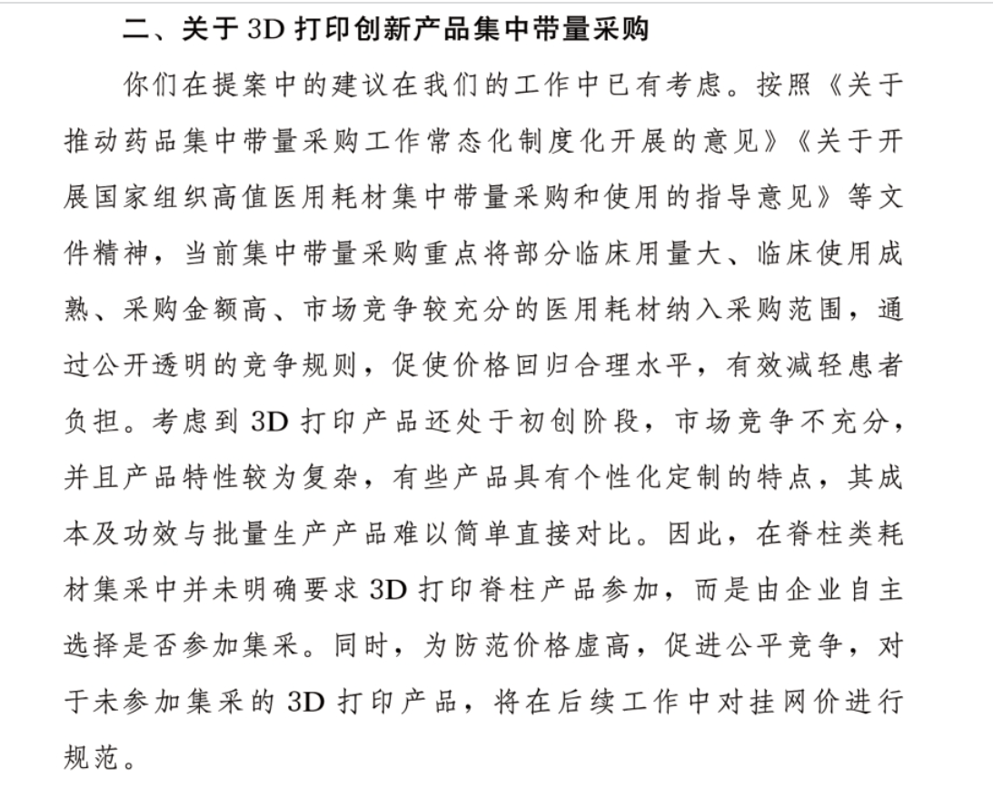 集采成为近些年影响医药行业的重要政策之一,常规化趋势之下,集采范围也正从早期的药品扩展到医疗器械品类。在这样的大背景下,有委员提出,3D打印脊椎创新产品不纳入集采范围。