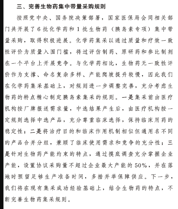 在回复函中,国家医保局提到生物药集采的难点:与化学药相比,生物药无一致性评价作为支撑、命名复杂多样、产能爬坡提升较慢。同时表示,将在现有集采成功经验基础上,结合生物药的特点,不断完善生物药集采规则。