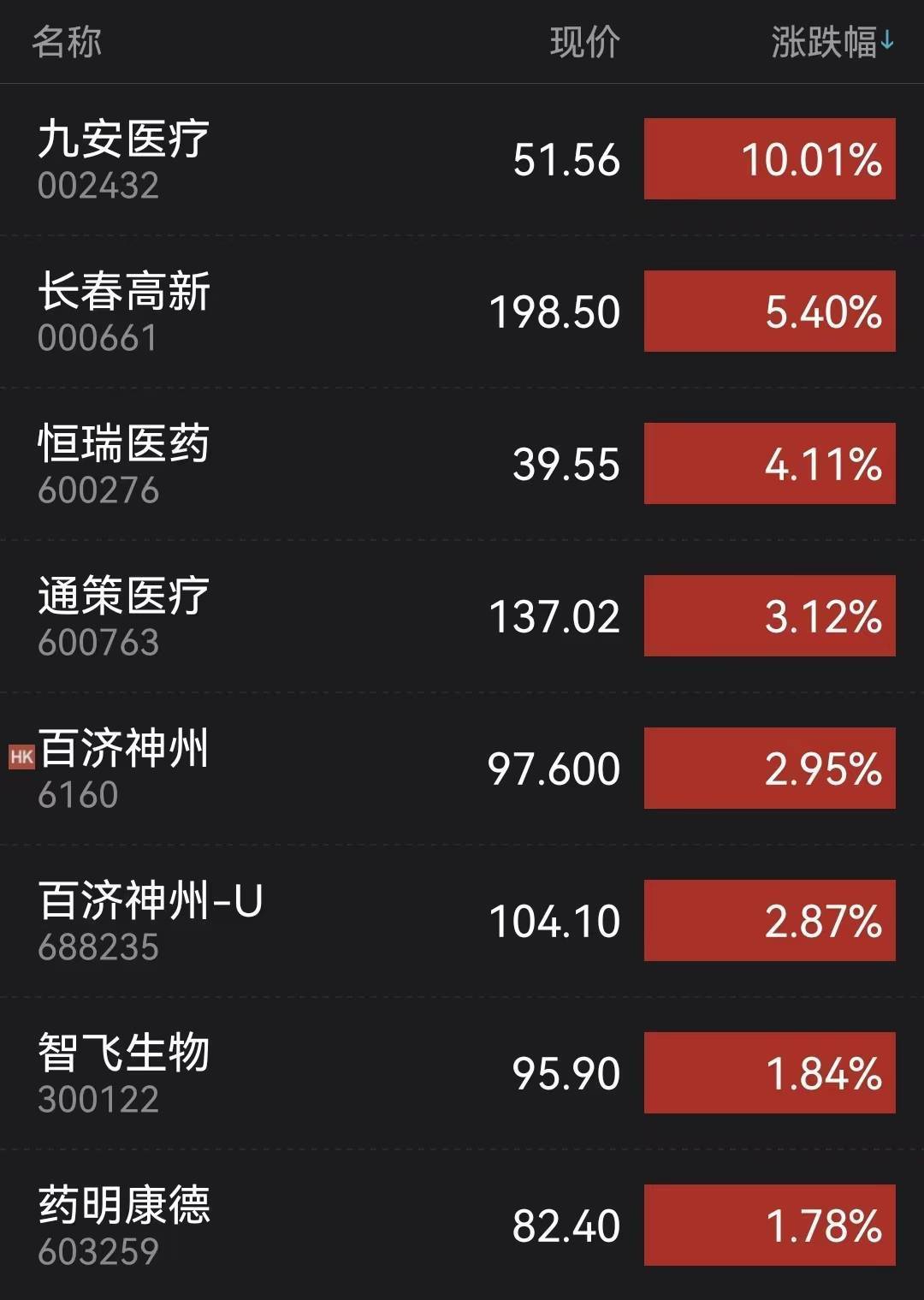 个股方面,医药行业龙头均有不同程度上涨,其中“医药一哥”恒瑞医药(600276)最高涨超6%,收涨4.11%;“创新药一哥”百济神州(688235)最高涨近6%,收涨2.87%,“医疗器械茅”迈瑞医疗(300760)收跌2.99%,但盘中最高涨近4%;因新冠抗原试剂盒大火的九安医疗(002432)涨停,“疫苗茅”智飞生物(300122)最高涨超7.7%,收涨1.84%;CXO千亿巨头药明康德(603259)收涨1.78%,盘中最高涨超4%。
