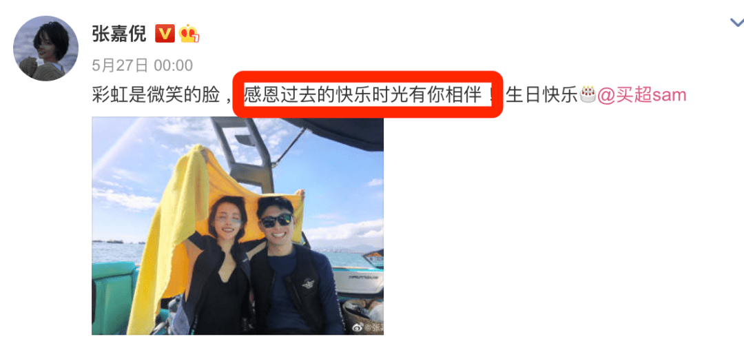 今年5月买超过生日的时候,张嘉倪在微博给他送祝福,文案也被网友发现有些不对劲。毕竟“彩虹是微笑的脸”的下一句是“抬起头难过就大声唱”,歌词出自王心凌一首蛮出圈的唱失恋的歌。