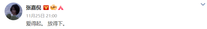 直到张嘉倪本人上线回应,“爱得起,放得下”,算是言简意赅承认了她和买超已经分开,但因为张嘉倪并没有过多解释,其他几位当事人也没有出来说话,导致网友现在还有点搞不清状况。