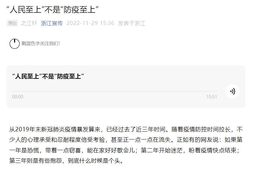 11月29日,“浙江宣传”微信公众号发文:“人民至上”不是“防疫至上”。疫情防控是为了防住病毒,不是为了防住人;从来只有“人民至上”,没有所谓的“防疫至上”。不管采取什么样的防控措施,都应该是为了让社会能够早日回归正常,让生活尽快回到正轨。