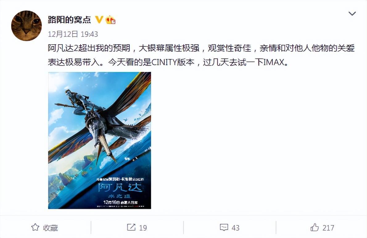 导演路阳的评价是“《阿凡达2》超出我的预期,大银幕属性极强,观赏性奇佳,亲情和对他人他物的关爱表达极易带入。”
