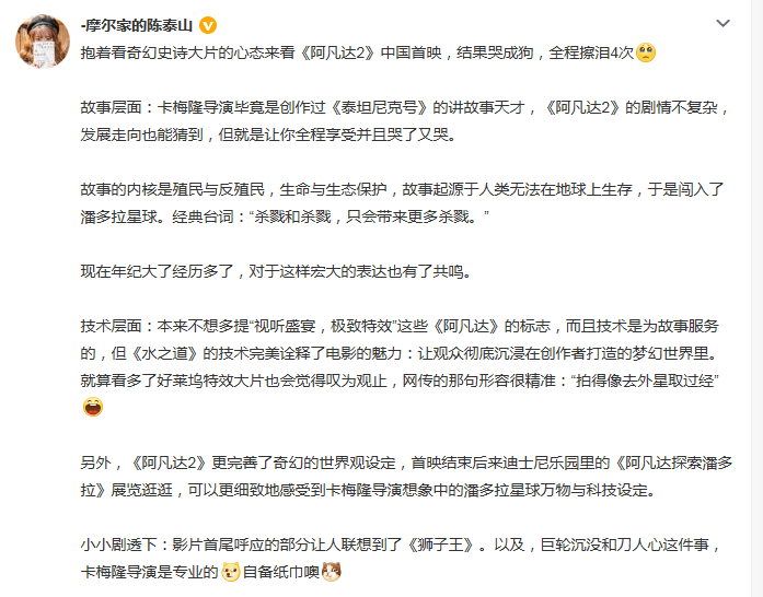 时尚领域的K0L也给出很高评价,表示自己“哭成狗,全程擦泪4次。”他认为《阿凡达2》的故事内核是殖民与反殖民(似乎和第一部一脉相承),生命与生态保护。并表示《阿凡达2》的技术完美诠释了电影的魅力,让观众彻底沉浸在创作者打造的梦幻世界里,就算看多了好莱坞特效大片也会觉得叹为观止。