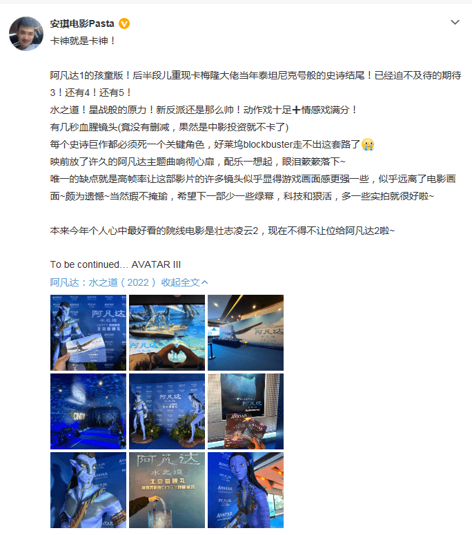 翻了下社交平台,发现看过的观众一边倒给出很高的评价,基本可以确定,《阿凡达2》是卡梅隆打造出的又一部超越前作的特效大片,没有辜负观众,192分钟的时长应该能值回票价。