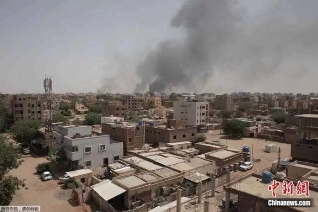 2023年4月16日,烟雾在苏丹首都喀土穆升起。非洲国家苏丹军方与该国主要准军事组织快速支援部队(RSF)在喀土穆的激烈武装冲突进入第二天。