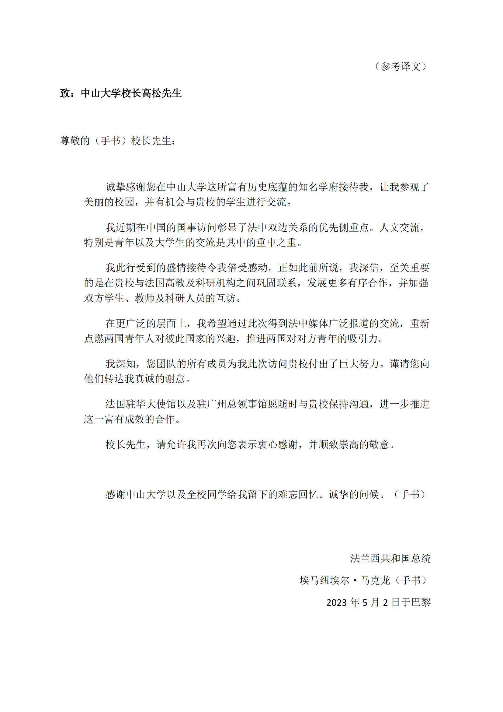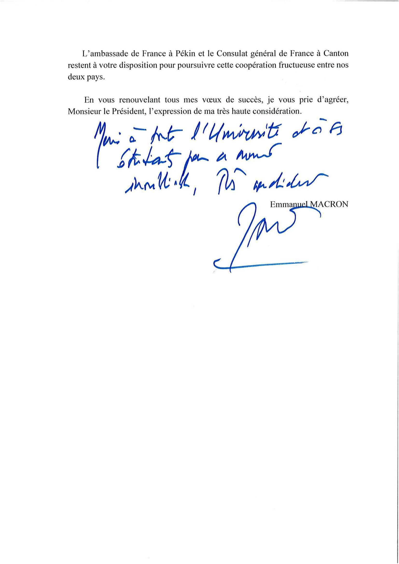 马克龙在信中表示,法国驻华大使馆以及驻广州总领事馆愿随时与中大保持沟通,进一步推进这一富有成效的合作。感谢中山大学以及全校同学给我留下的难忘回忆。