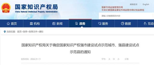 根据通知,经申报、推荐、专家评审等程序,此次国家知识产权局确定了18个城市(城区)为国家知识产权强市建设示范城市,38个城市(城区)为国家知识产权强市建设试点城市,30个县(市、区)为国家知识产权强县建设示范县,97个县(市、区)为国家知识产权强县建设试点县。试点示范时限自2024年1月至2026年12月。