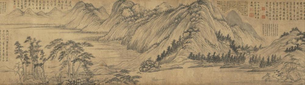 图为长卷,纵仅33 厘米,横636.9 厘米,山峰起伏,林乱晚宴,平岗连绵,江水如镜,境界开阔辽远,雄秀苍莽,简洁清润,使人心旷神怡。凡数十峰,一峰一状,数百树,一树一态,天真烂漫,变化极矣。其山或浓或淡,皆以干而枯的笔勾皴,疏朗简秀,清爽潇洒,全如写字,远山及洲渚以淡墨抹出,略见笔痕。水纹用浓枯墨复勾。偶加淡墨复勾。树干或两笔写出,或没骨写出,树叶或横点,或竖点,或斜点,或勾写松针,或干墨,或湿墨,或枯笔。山和水全以干枯的线条写出,无大笔的墨,惟树叶有浓墨、 湿墨,显得山淡树浓。远处的树有以浓墨点后再点以淡墨,皆随意而柔和。虽师出董、巨,而又全抛弃董、巨,把赵孟頫在《水村图》、《鹊华秋色图》、《双松平远图》中所创造的新法又推向一个高峰,自出一格,元画的特殊面貌和中国山水画的又一次变法得以完成。山水画至此,已如抒情诗。元画的抒情性,也全见于此卷也。后世的面对此图无不顶礼膜拜:“吾师乎,吾师乎,一丘五岳,都具是矣。”这是董其昌题句时的惊呼,又谓:“此卷一观,如诣宝所,虚往实归,自谓一日清福,心脾俱畅。”“诚为艺林飞仙,迥出尘埃之外者也。”邹之麟题识谓:“知者论子久画,书中之右军(王羲之)也,圣矣。至若《富春山居图》,笔端变化鼓舞,又右军之《兰亭》也,圣而神矣。”