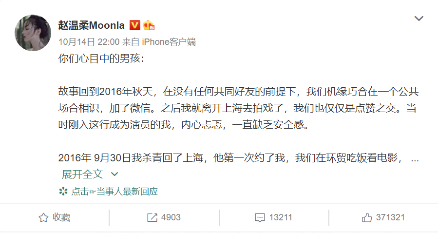故事是这样的,14日晚,演员@赵温柔Moonla 在微博发长文爆料与某选秀男艺人的恋爱经过。