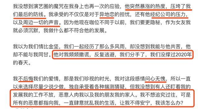 一共是一千二百多字的微博长文,讲述了自己和选秀男艺人从2016年在一起,到2020年春天分手期间的恋爱经过,包括介绍自己的资源给男方,为了男方发展隐藏自己的女友身份。